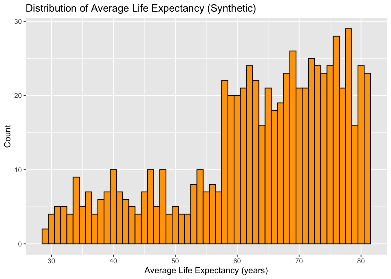 labs(title = "Distribution of Average Life Expectancy (Synthetic)", x = "Average Life Expectancy (years)", y = "Count")