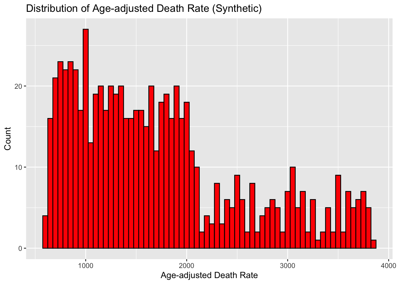 labs(title = "Distribution of Age-adjusted Death Rate (Synthetic)", x = "Age-adjusted Death Rate", y = "Count")