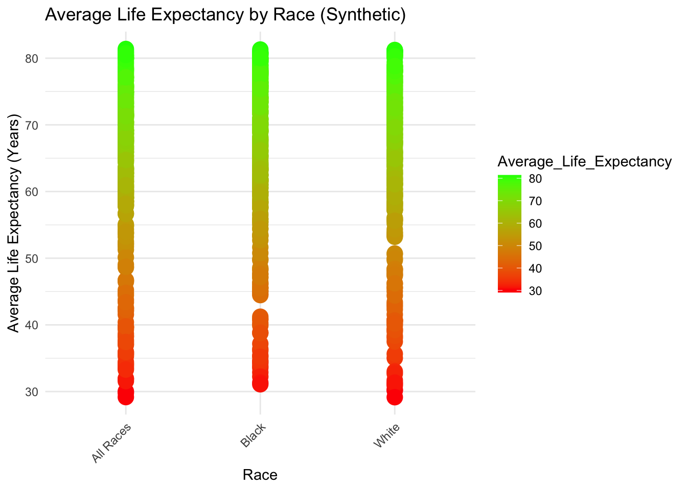 Synth_AvgLife_Race_plot <- ggplot(synth_data, aes(x = Race, y = Average_Life_Expectancy, color = Average_Life_Expectancy)) +