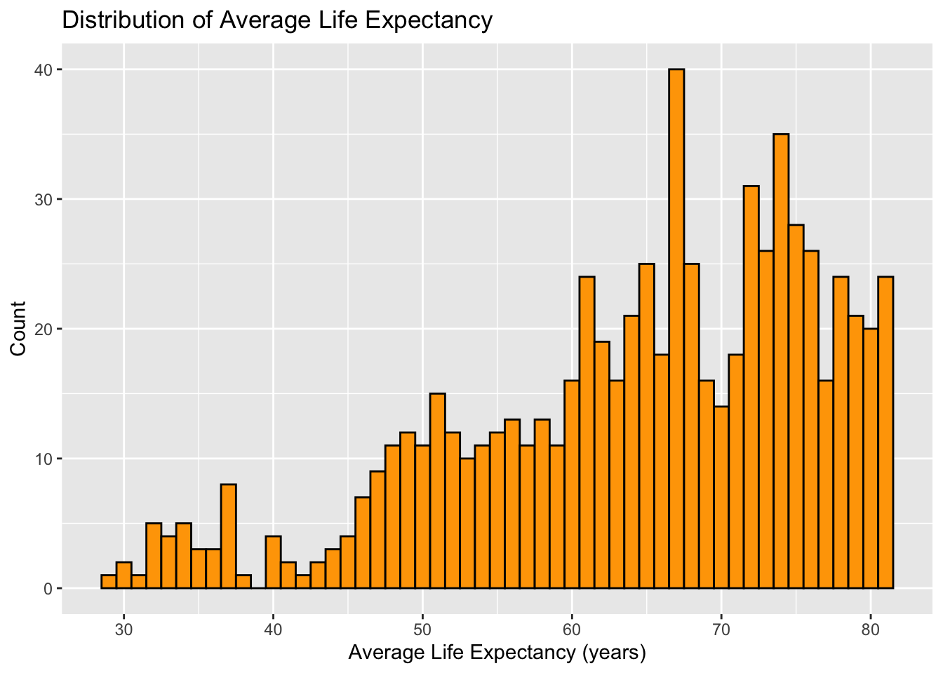 labs(title = "Distribution of Average Life Expectancy", x = "Average Life Expectancy (years)", y = "Count")