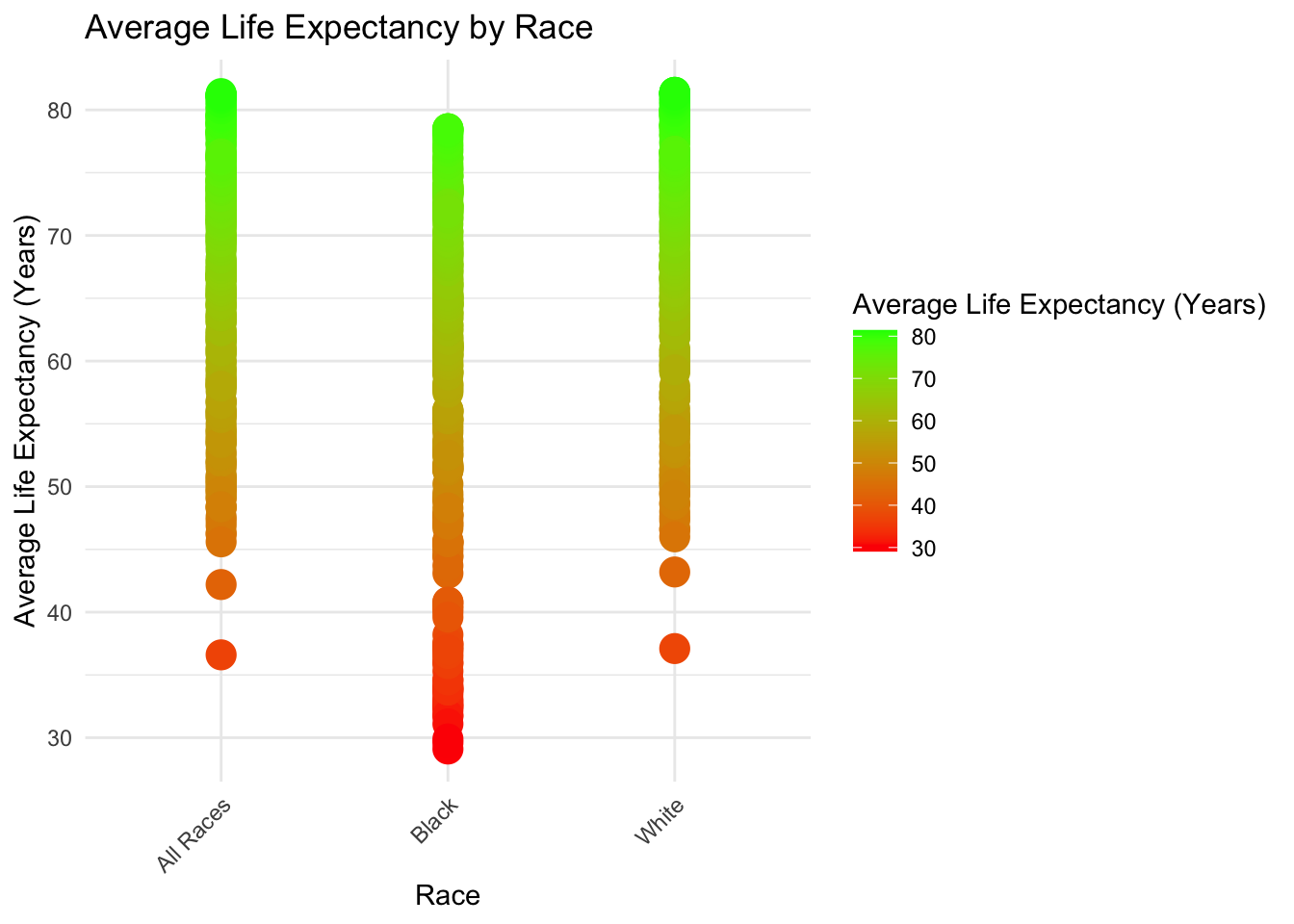 AvgLife_Race_plot <- ggplot(death2, aes(x = Race, y = `Average Life Expectancy (Years)`, color = `Average Life Expectancy (Years)`)) +